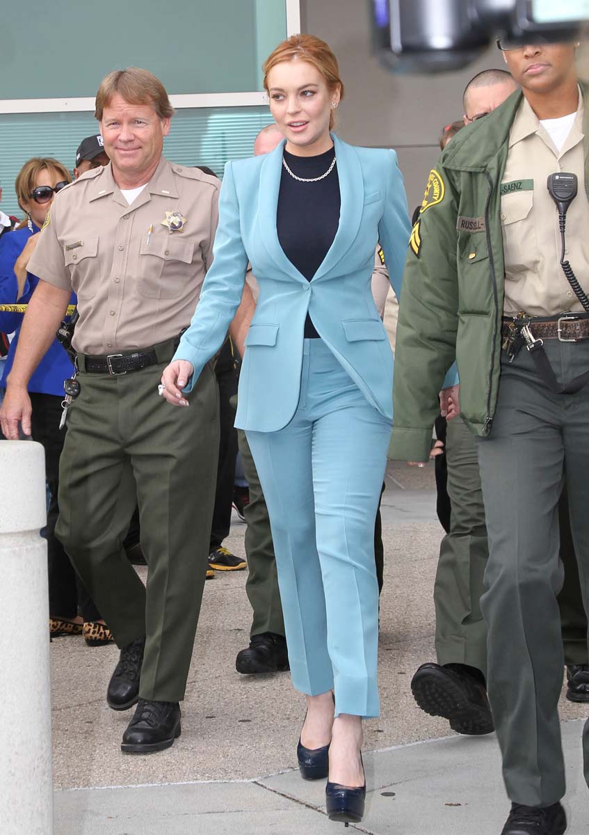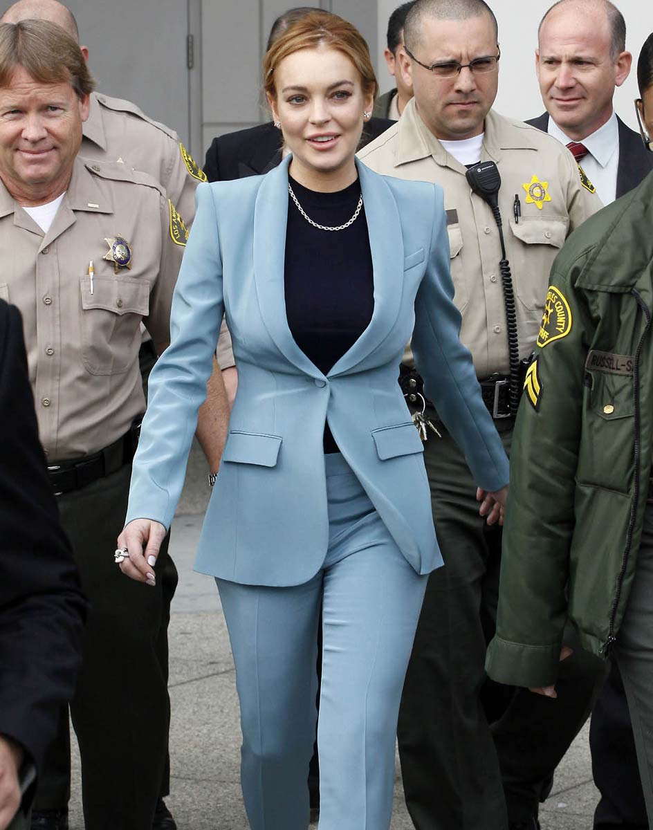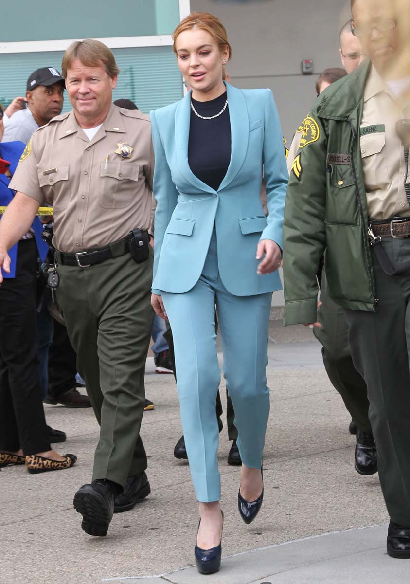 Lindsay Lohan finished her probation and can finally get things back on track. Here are some pictures of Lindsay at her last court appearance yesterday, at least she hopes it was her last appearance, until she fuck up again… I hope it will not, at least not in the near future, I hope that we will finally be able to see again some quality girl on girl action. Anyhow, I really like her sexy blue business suit, she looks like one of those sexy lady lawyers you’d see in a TV show from the seventies. I’ll miss in some way her sexy appearances at the court…